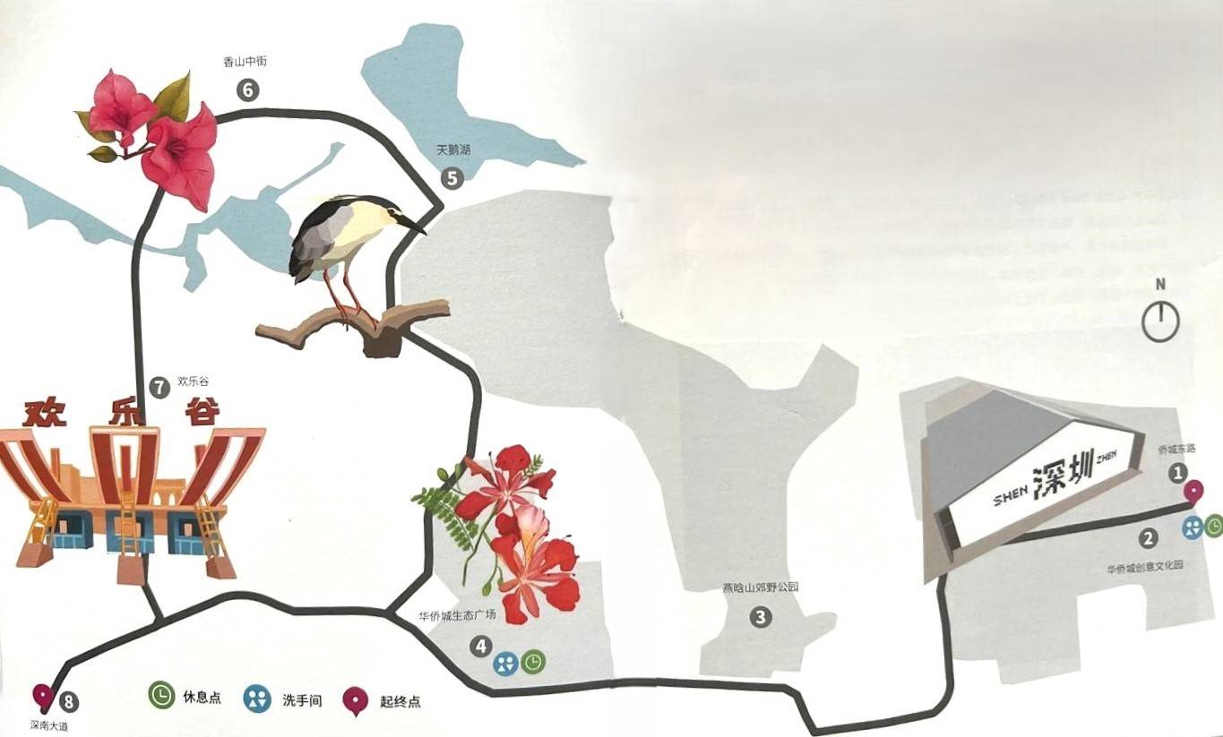 步道以僑城東路為起點,進入華僑城創意文化園,看展覽、喝咖啡,探尋各 類小而美的店鋪。橫穿園區,經汕頭街轉入僑城東路,途中經燕晗山郊野公園、華僑城生態廣場,探尋城中森林祕境。沿著杜鵑山東街向北走,路的另一側是國內最 早的主題樂園之—歡樂谷。走至路的盡頭,遇香山中街向西拐。香山中街是深 圳春天最美的街道之一,行走時一路簕杜鵑花如影隨形。最後抵達深南大道,這條貫穿城市東西的主幹道見證了深圳從邊陲小鎮崛起為國際化大都市。