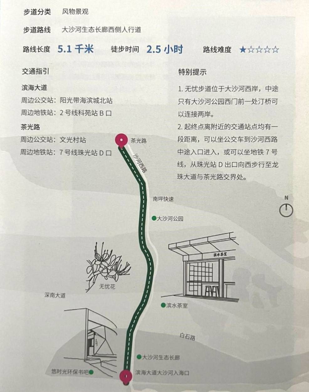 無憂步道從濱海沙河西立交橋下的大沙河入海口起步,到龍珠大道與茶光路交 界處終止,全程約5.1千米。如果你還沒盡興,向北可以繼續沿著大沙河向上游漫走,向南可以接續一段深圳灣公園的海濱步道。