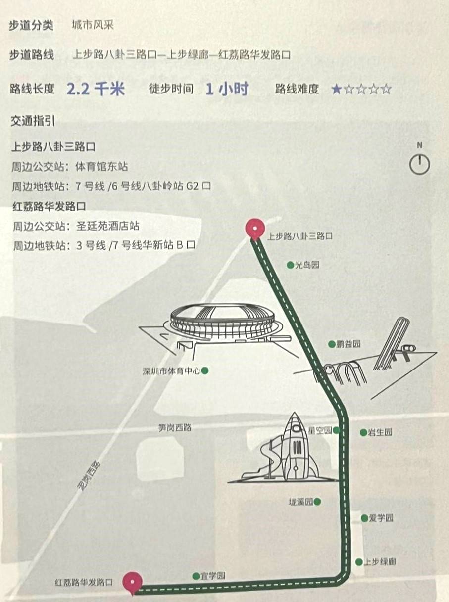 從上步路八卦三路口出發,經過深圳市體育中心,直行便可到達上步綠廊公園。這條綠色休閒帶以「生態優先、韌性健康、全齡友善」為原則,透過修復地表環境,結合市民需求, 在上步路兩側打造了9個各具特色的社區公園。其間,有兒童友善型的玩樂裝置,也有為年長者設計的休憩空間,而隨處可見的健身設施更讓這片城中綠地彰顯出無限活力。